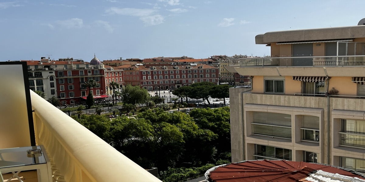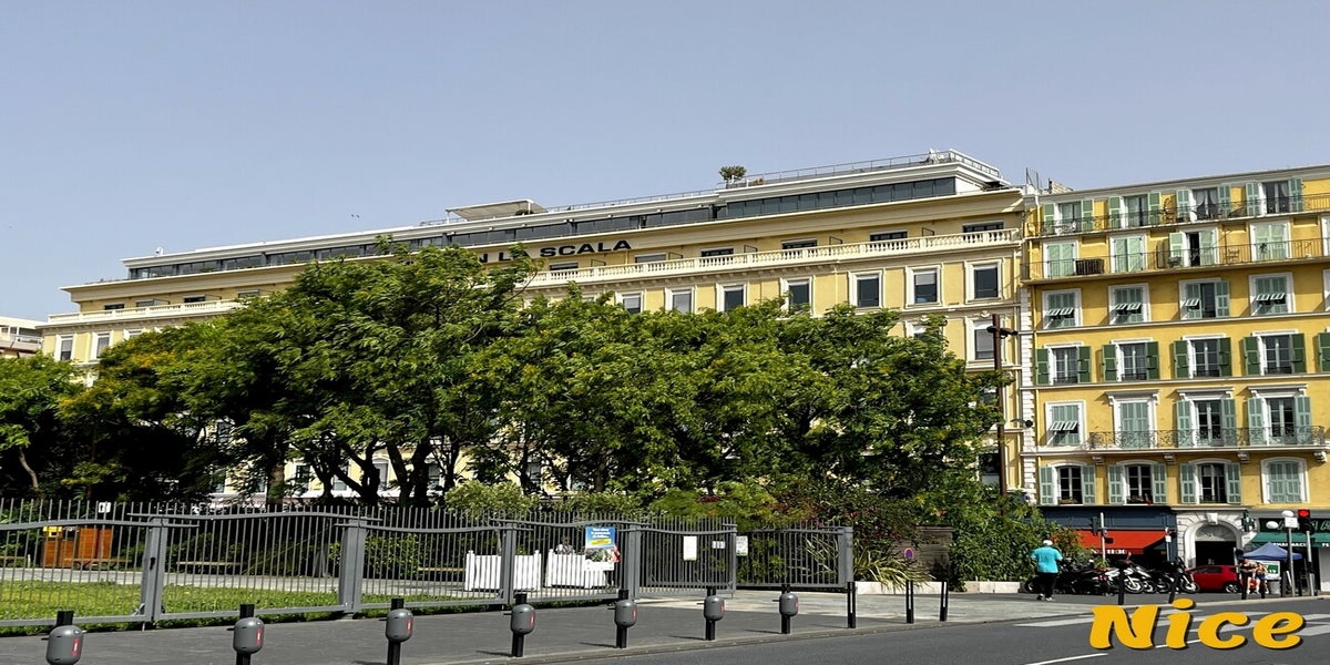 L'aéroport de Nice est le point de départ pour la première étape de notre voyage. Nous prenons la voiture de location et nous nous rendons à l'hôtel Aston La Scala dans le vieux Nice. L'hôtel est très bien situé, car nous sommes à seulement cinq minutes de marche de la Promenade des Anglais, à trois minutes de la Place Masséna et à cinq minutes de la plage. Elle dispose d'une terrasse avec une piscine sur le toit. La vue est magnifique sur Nice.